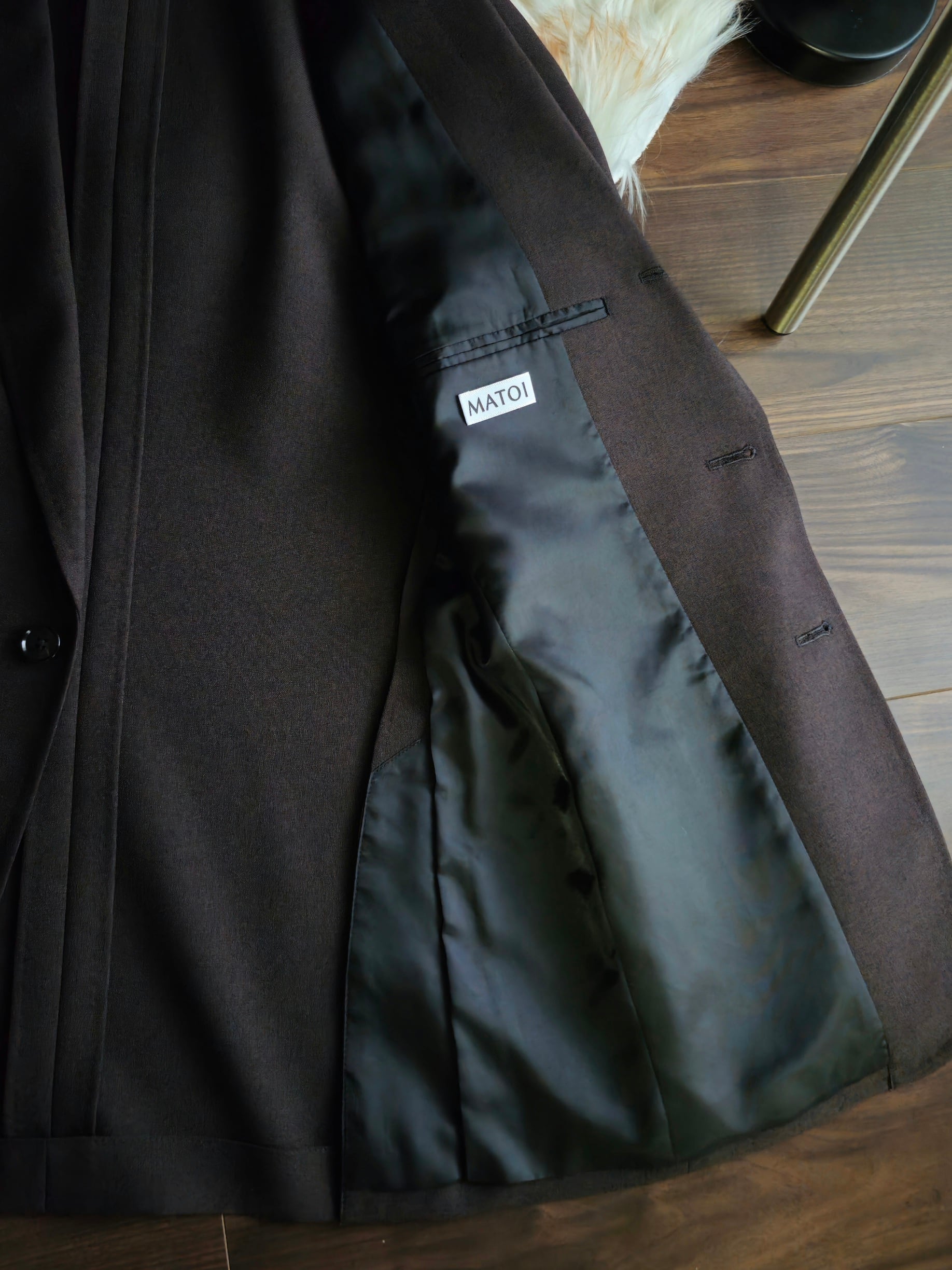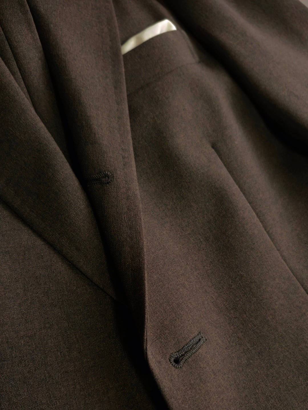 和服のような、なだらかな肩傾斜と軽やかな着用感が特徴のシングルモデル。“単衣”に由来するその名の通り、一枚仕立てに近い羽織感覚のジャケットと、袴のようなインタックが特徴的なテーパードパンツの組み合わせ。ハンド風ステッチや、段返りの3ッ釦仕様、パンツのウォッチポケットなど、クラシックなドレスディテールもふんだんに取り入れたMATOIの概念を体現する一型。