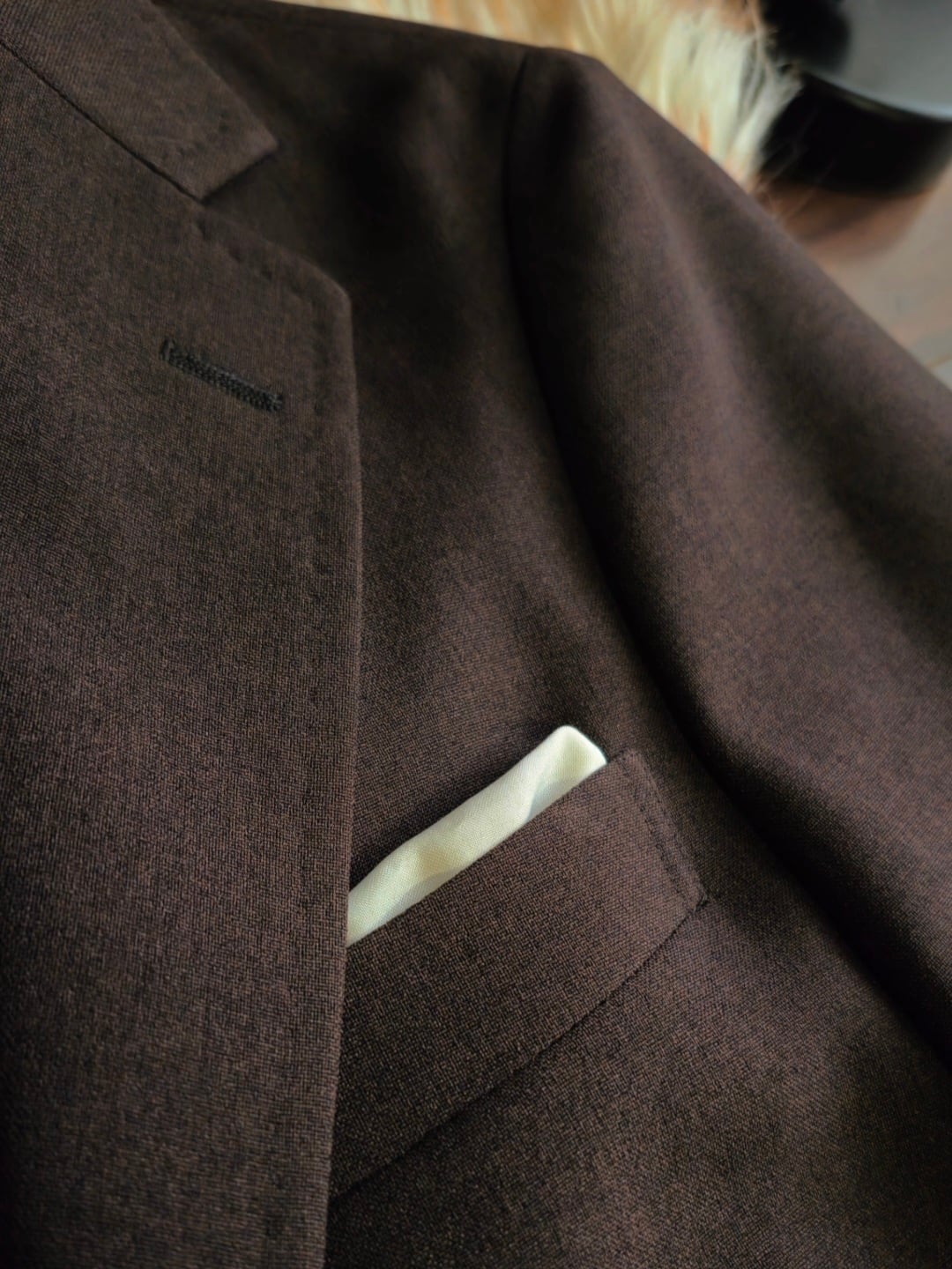 (胸ポケットの袋地にチーフ生地を使用。引っ張り出してチーフとして使用できます)