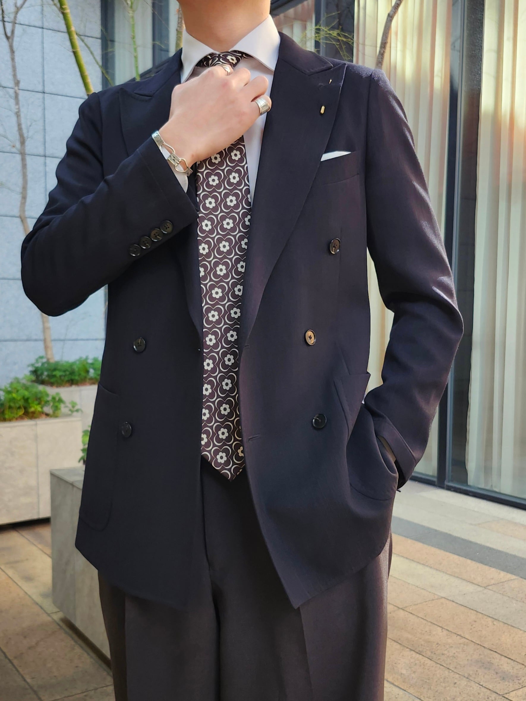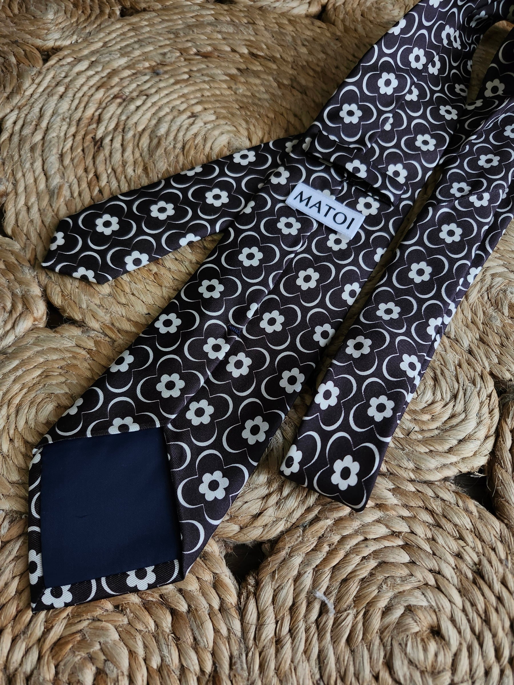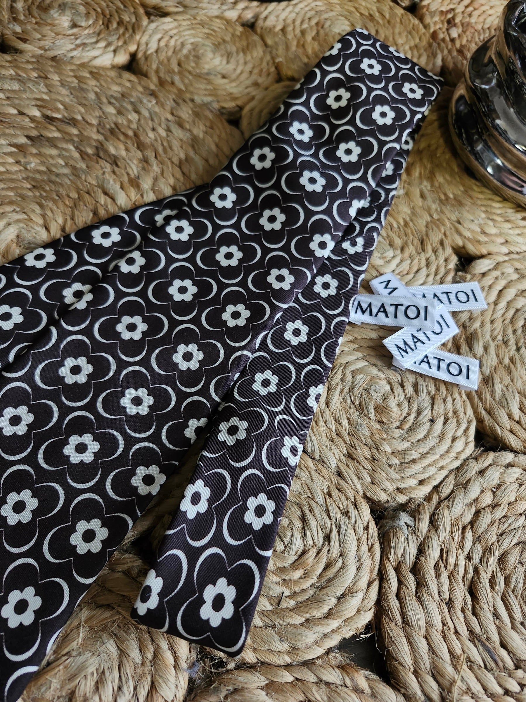 和服や浴衣にあしらわれた日本古来の柄をモチーフに、現代的にアレンジして描き下ろしたオリジナル柄のシルクタイ。ほのかにレトロで、ハイカラな雰囲気を湛えつつも使いやすい、現代的な着こなしにマッチするモダンクラシックなタイシリーズです。こちらは和服に設えられた花の紋をモチーフに描き下ろしたフラワーパターンが粋な一本。適度にしっかりとした風合いで、結び応えのある芯地を採用。立体的で美しいVゾーンを形成します。